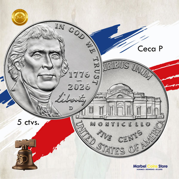 • Inscripciones: «United States of America», «E Pluribus Unum», «Five Cents» y la fecha «1776–2026».