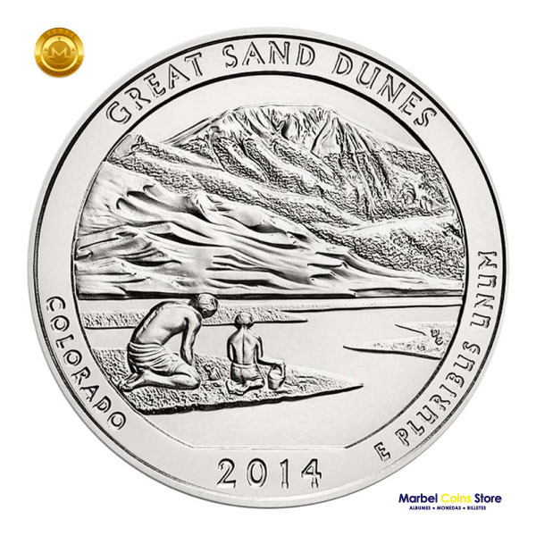 El Cuarto de Dólar del Parque Nacional Great Sand Dunes 2014 representa al estado de Colorado y fue acuñado en la Casa de la Moneda de Filadelfia (P) o Denver (D).