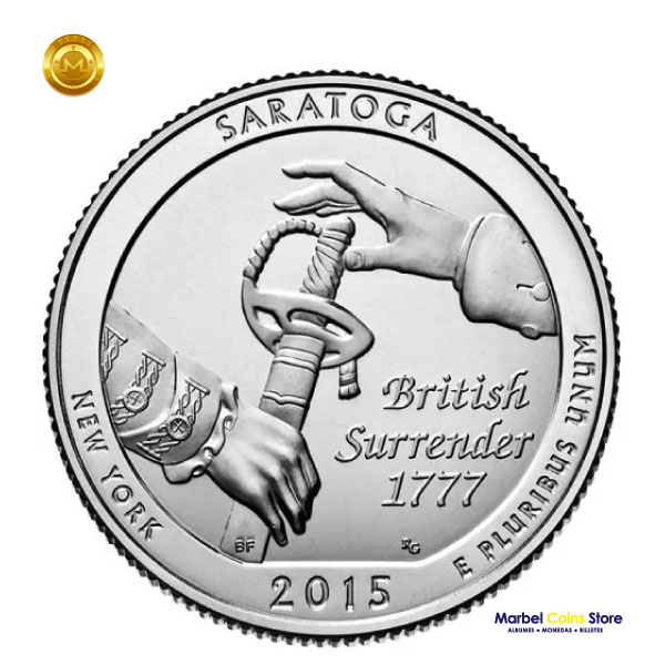 La moneda de 25 centavos del Parque Histórico Nacional de Saratoga 2015 representa al estado de Nueva York y fue acuñada para circulación en las Casas de la Moneda de Filadelfia (P) y Denver (D).