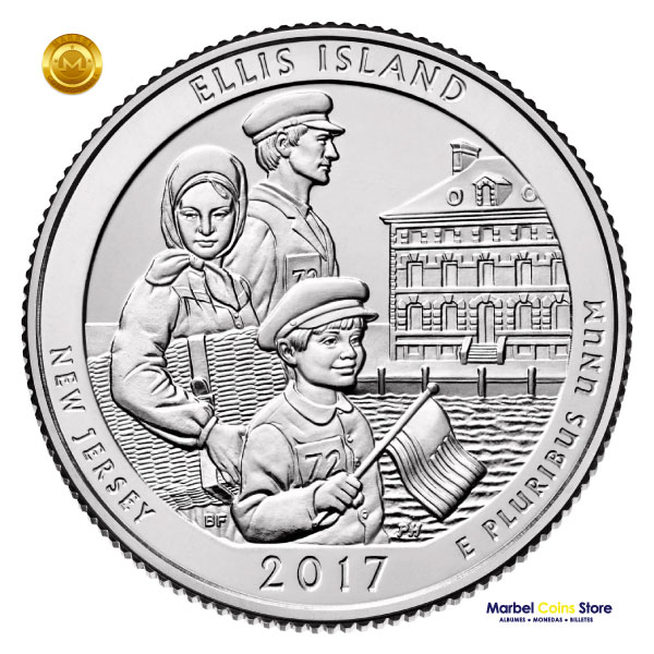 La moneda de 25 centavos de Ellis Island de 2017 representa al estado de Nueva Jersey y forma parte de la serie «América la Hermosa» (America the Beautiful). Este diseño honra el legado de la inmigración en Estados Unidos.