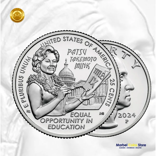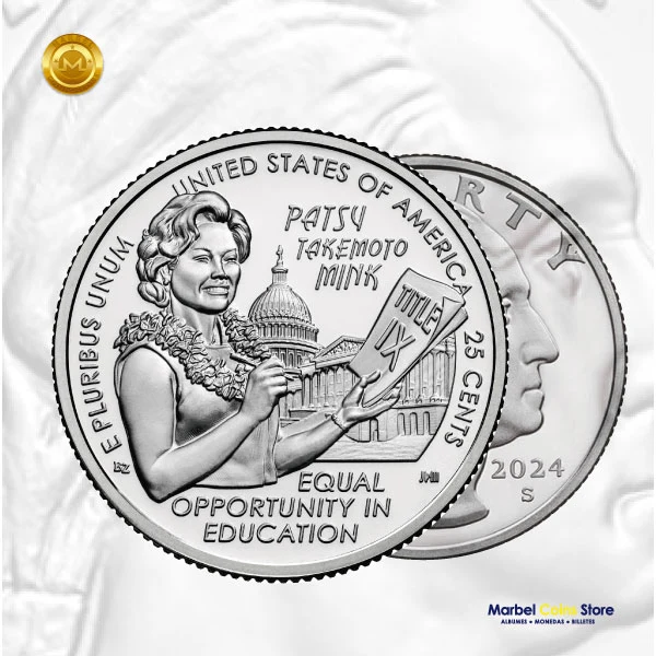 Presentamos la moneda de 25 centavos de Patsy Takemoto Mink de 2024, un homenaje a una de las figuras más importantes de la historia estadounidense. Acuñada en la prestigiosa Casa de la Moneda de San Francisco, esta moneda celebra el legado de una verdadera defensora del cambio social.