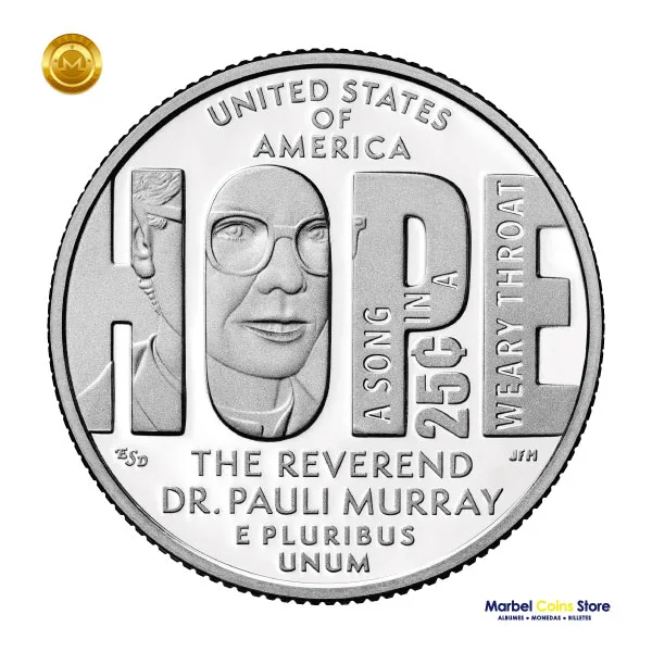- Diseño inspirador: El anverso de la moneda presenta un cautivador retrato de la Reverenda Dra. Pauli Murray que captura la esencia de su incansable compromiso con la justicia. Su mirada digna refleja la fortaleza que definió su extraordinaria trayectoria.