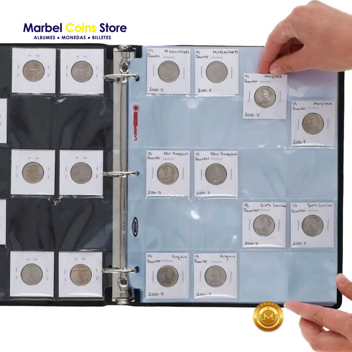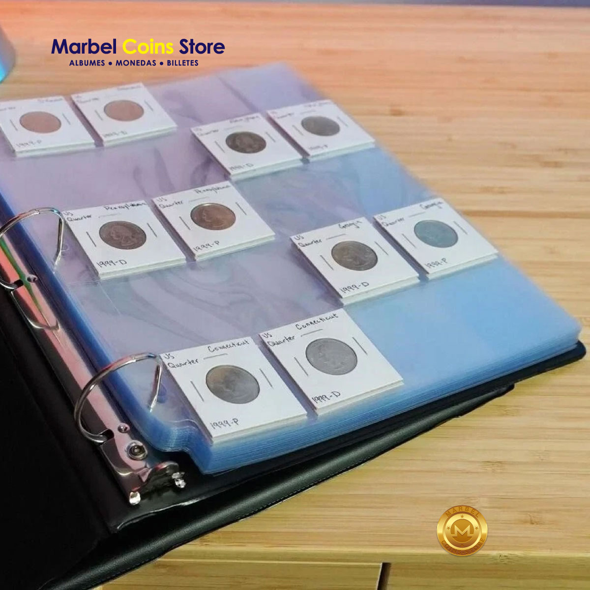 Presentación: Estas páginas se venden en paquetes o cajas de 20, 50 o 100 páginas. Por ejemplo, una «Caja de Monedas de 20 Bolsillos» puede referirse a una caja que contiene 100 de estas hojas.