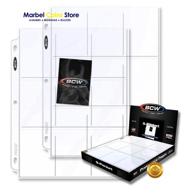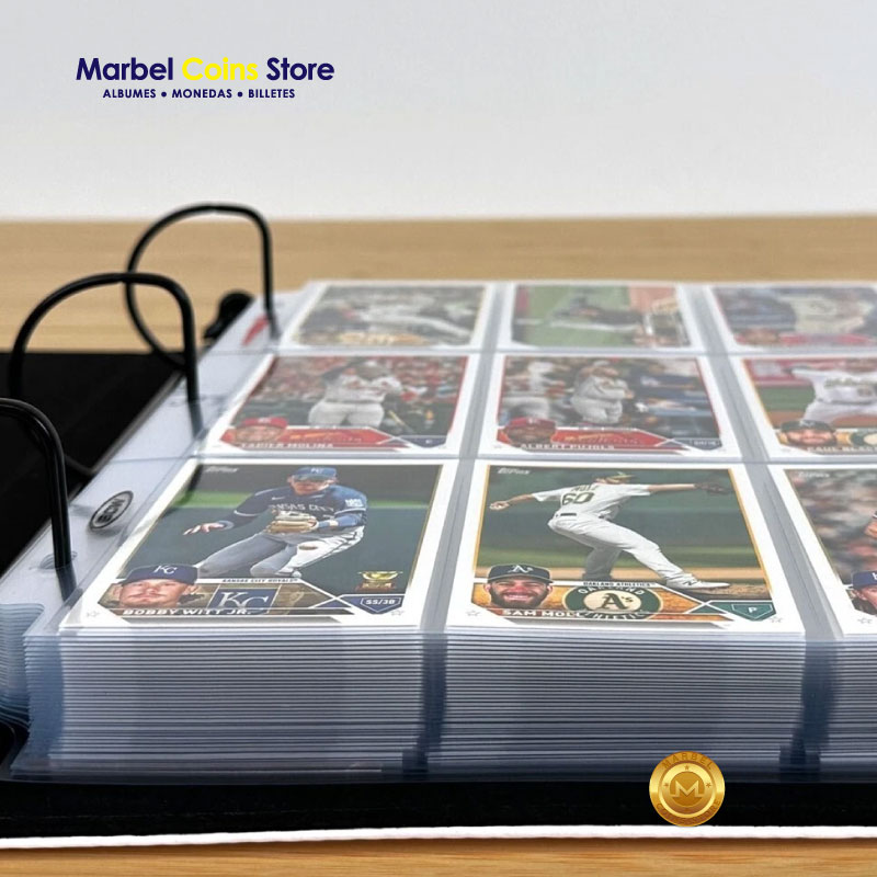 9 bolsillos por página. Una caja de 100 páginas puede almacenar hasta 900 tarjetas.