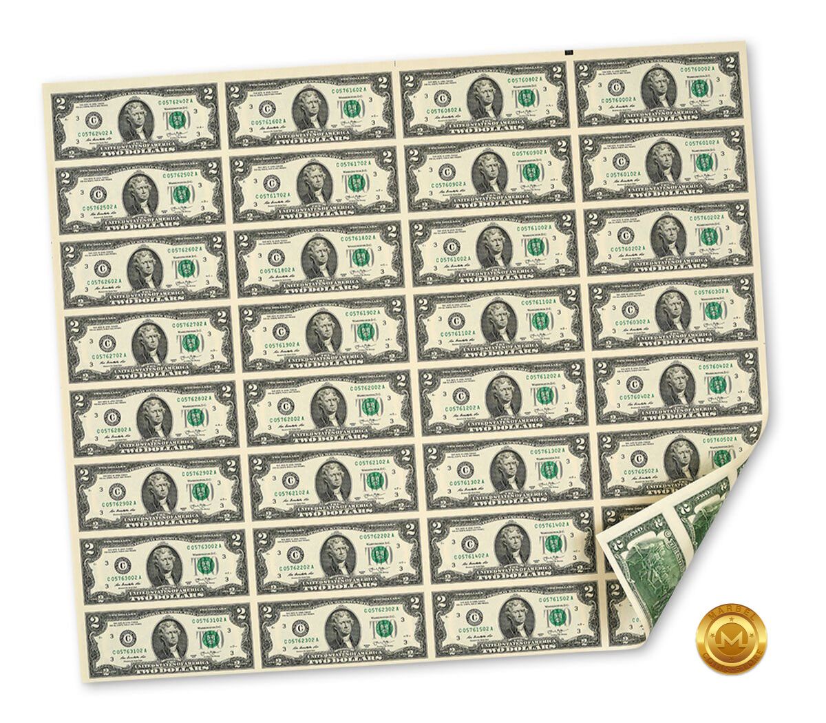 Hoja de 32 Billetes de $2 USA – Edición Sin Cortar