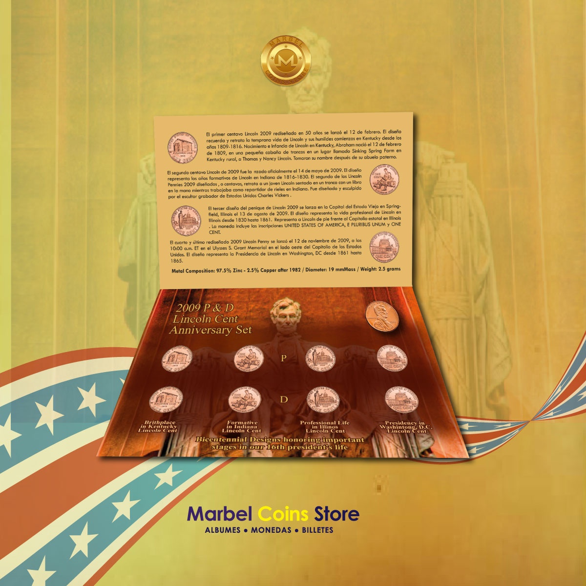Este mini álbum es perfecto para los entusiastas que desean coleccionar las ocho emisiones especiales del Bicentenario de Lincoln de 2009. Diseñado específicamente para esta serie conmemorativa, el álbum cuenta con ocho espacios individuales: cuatro para las monedas acuñadas en la Casa de la Moneda de Filadelfia (ceca P) y cuatro para las acuñadas en la Casa de la Moneda de Denver (ceca D).