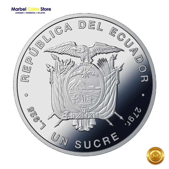 | Reverso | Escudo de Armas del Ecuador | Muestra el escudo nacional acompañado de la leyenda «REPÚBLICA DEL ECUADOR». También se indican las especificaciones numismáticas como la pureza (L.925) y el peso (27 gr.). |